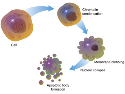 Apoptosis is the course of programmed cell death that occurs in eukaryotic organisms due to some biochemical events. These changes include forming a bulge of the plasma membrane of a cell, cellular contraction, DNA & nuclear fragmentation, chromatin condensation, and decaying of mRNA. It is used during early development to eliminate unwanted cells; for example, to develop the space between the fingers of a developing hand. In human adults, apoptosis is used to get free from the cellular body that have been damaged beyond repair. The average human adult loses between 50-70 billion cells per day due to apoptosis. For an average human child between the ages of 8 & 14, approximately loses 20–30 billion cells per day.
