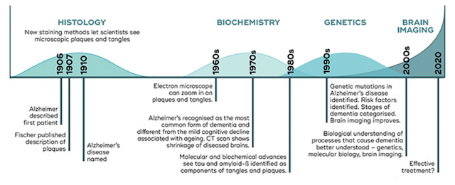 Described nearly a century ago by Alois Alzheimer in Alzheimer’s disease (AD) is characterized by an early deterioration in memory followed by progressive impairment of other cognitive domains and concurrent large-spectrum psychological and behavioral symptoms (1). Prior to the description of AD, the disease was primarily characterized as simple dementia. The mistake is natural, given that AD is the most common form of dementia in geriatric populations, accounts for 50 to 80% of all dementia cases (2). Impairments like dementia or AD have long been associated with advanced age. In roughly 2000 BC ago, ancient Egyptian seemed to aware that advanced age was associated with significant memory disorder (3), while over a millennia later, Solon wrote in his book that judgment could be impaired by physical pain, violence, drugs, and old age (4). Curiously there are some references to diseases like AD being distinct from dementia; for example, writers of Greek and Roman history presume the fabled stories of Agamemnon were true, but they identified psychopathology other than dementia. Unfortunately, these references disappeared by the middle ages—perhaps in an era marked by plague, religious warfare, and upheaval dementia did not inspire much interest or concern. Coincidentally, during this period, there were religious proscriptions against medical dissection. With the rise of the enlightenment and renewed interest in understanding the human body and mind (and a more open-minded attitude towards learning about either), there became renewed interest in understanding dementia. In the early 20th century, Alzheimer was investigating a 51-year-old woman who exhibited an unusual form of amnesia and an inability to answer questions and some other unusual symptoms. After her death, Alzheimer’s post-mortem examination of the body showed some novel features, notably distinctive plaques and tangles in the brain that we now know as neuritic plaques and neurofibrillary tangles. For a large part of the 20th century following this discovery, the only way to diagnose AD was to wait for the patient to die and examine the brain, and for most of this time, little Progress was made in actually understanding the etiology of the disease.