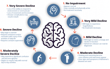 Recent advances in neurobiology and the pathogenesis of neurodegenerative diseases as well as the immense achievements of studies on human genetics paved the way for some updated diagnostic criteria and guidelines that were incorporated in 2011. The most important changes include the identification of three stages of Alzheimer’s disease before memory loss, and the search for Biomarkers test to confirm the presence and absence of the disease. These stages are mapped out to correspond to the severity of the disease. The first, Stage 1 (Mild) can last 2-4 years (7). During this period, patients with AD are less energetic and spontaneous, experience minor memory loss, exercise poor judgment, repeating sentences, and may withdraw, avoiding new places in favor of familiar ones. Next, Stage 2 (Moderate), the longest stage, lasting 2-10 years (8), is marked by the affected individual become clearly becomes disabled, requiring help in performing numerous tasks. Patients at Stage 2 may become more disconnected from their family and confused, forgetting recent events, family history, and even encounter difficulty recognizing familiar people. Similarly, speech problems increase, and patients may encounter problems in understanding reading, writing, and may invent new words. As the patients become aware of this loss of control, they may become dejected, short-tempered and restless. The final stage of the AD, Stage 3 (Severe) can last up to 3 years (9) during which patients encounter severe losses in basic functions, even losing their ability to feed themselves, speak, recognize people, and control bodily functions, (e.g., swallowing or bowel and bladder control). By this point, memory worsens and may become almost non-existent, patients sleep often and grunt or complaining. At this stage, constant care is critical. In a weakened physical state, patients may become susceptible to other illnesses such as skin infections or respiratory problems, particularly when they are unable to move on their own (10).