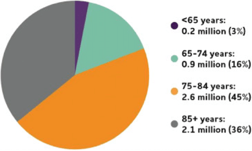 Current epidemiological forecasts predict that AD will have a marked impact on both the medical system and society at large due to the prevalence of AD dementia and the distribution of Alzheimer’s being most reported in patients 60-65 years old (12,13), which will continue to form a much larger share of the population in developing and developed countries worldwide. While early onset of Alzheimer’s can occur much earlier than 60 years of age, the frequency to dementia is relatively low at this early stage, and there is exponential increase in the dementia with age (reaching almost 50% those in 85 years of age). This risk increases even further past 85, from 12.5% per year after 90 years of age, 90-94 years age group to 21.2% per year in the 95-99 years old age group, and to 40.7% per year in those at least 100 years of old.