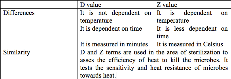 When the bacterial suspension is exposed to heat, it shows logarithmic decrease in its population. It means that when microbes are exposed to heat at a particular temperature for specific time, same percentage of microbes would die every time. This characteristic is used for thermal mathematical calculation. Hence, D and Z values are used to determine the heat sensitivity and resistance of microbes.