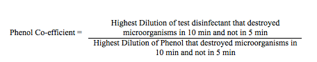 The antimicrobial activity of test disinfectant is determined by dividing the highest dilution of the chemical being tested that destroyed the microorganisms in 10 minutes but not in 5 minutes by the highest dilution of phenol that destroyed the microorganisms in 10 minutes but not in 5 minutes. When phenol co-efficient of test disinfectant is equal to 1, then it means that the test disinfectant efficiency is equivalent to phenol. When phenol co-efficient is more than 1, it means the test disinfectant is better than phenol. However, if it is less than one, then it indicates that the test disinfectant is inefficient than phenol. Hence, the value 1 or less than 1 or more than 1, indicates the efficiency of disinfectant with respect to phenol.